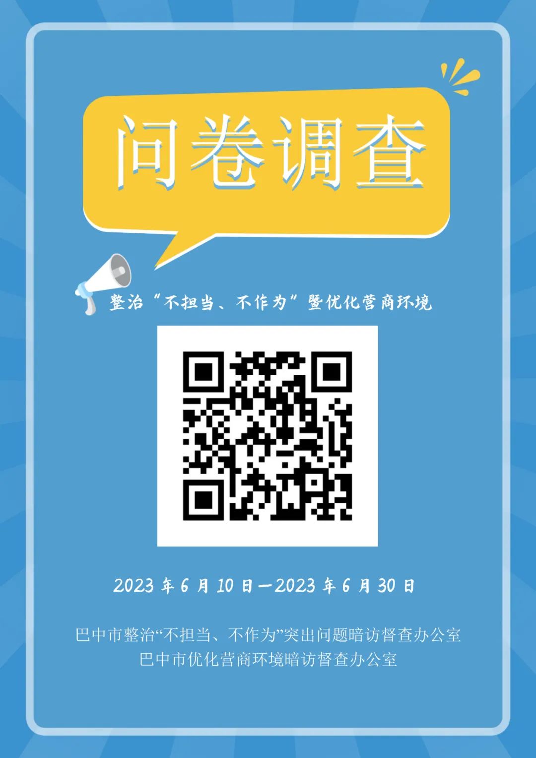 為深入整治“不擔(dān)當(dāng)、不作為”突出問題,更好地了解全面從嚴(yán)治黨、決策部署落實、優(yōu)化營商環(huán)境、推動鄉(xiāng)村振興、保障民生改善、防范化解風(fēng)險等方面的情況,以及廣大干部群眾和企業(yè)對干事創(chuàng)業(yè)環(huán)境的切身感受,按照市委、市政府工作安排,巴中市整治“不擔(dān)當(dāng)、不作為”突出問題暗訪督查辦公室、巴中市優(yōu)化營商環(huán)境暗訪督查辦公室決定開展整治“不擔(dān)當(dāng)、不作為”突出問題暨優(yōu)化營商環(huán)境網(wǎng)絡(luò)問卷調(diào)查,調(diào)查時間為2023年6月10日至6月30日。
