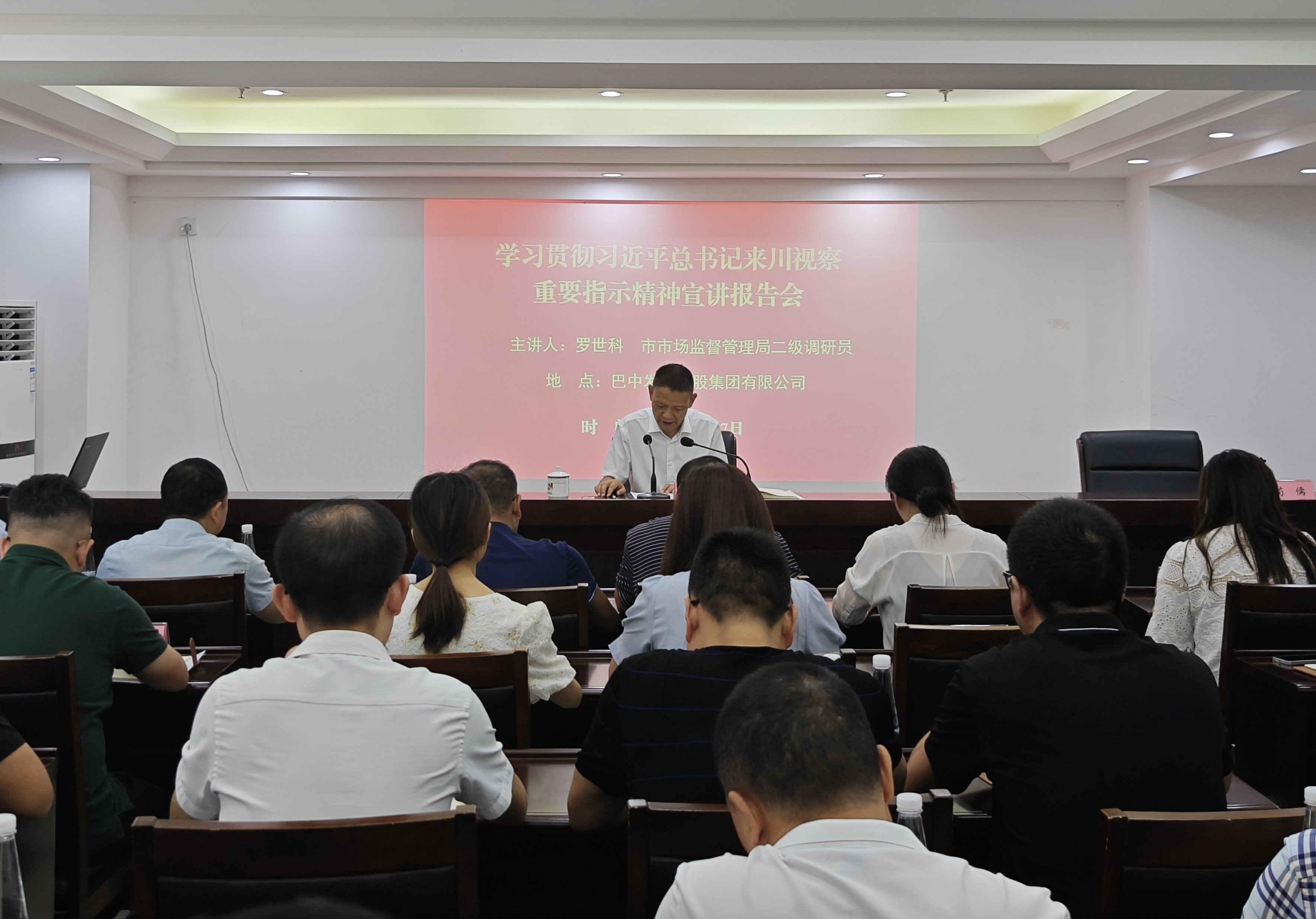 9月7日,為深入學習宣傳貫徹習近平總書記來川視察重要指示精神,市委宣講團企業(yè)宣講分隊在巴中發(fā)展控股集團有限公司開展專題宣講活動。市市場監(jiān)督局二級調(diào)研員羅世科做專題宣講報告,集團公司中層管理人員,下屬二、三級企業(yè)領導班子成員等參加會議。