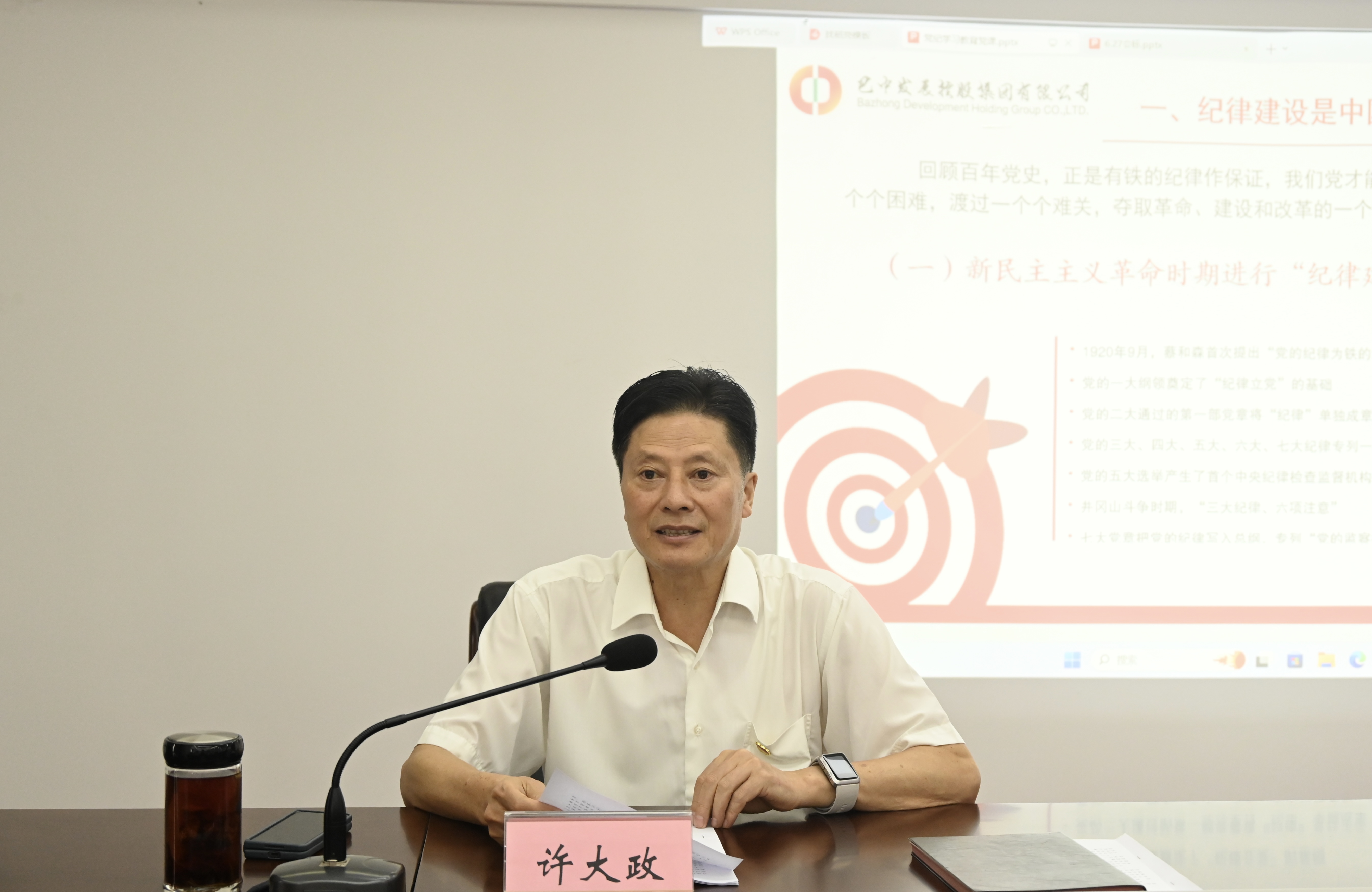 活動(dòng)當(dāng)天,巴中發(fā)展控股集團(tuán)有限公司黨委書記、董事長許大政以“學(xué)紀(jì)知紀(jì)明紀(jì)守紀(jì)踐行忠誠干凈擔(dān)當(dāng)”為主題,圍繞紀(jì)律建設(shè)是中國共產(chǎn)黨克敵制勝的重要法寶、充分認(rèn)清黨員干部違紀(jì)違法的嚴(yán)重危害、當(dāng)前黨員干部在遵規(guī)守紀(jì)方面存在的問題、以實(shí)際行動(dòng)踐行忠誠干凈擔(dān)當(dāng)?shù)确矫妫鷦?dòng)講授了一堂黨紀(jì)學(xué)習(xí)教育專題黨課,教育引導(dǎo)全體黨員銘記黨的奮斗歷史、傳承黨的紅色基因、弘揚(yáng)偉大建黨精神,真正將紀(jì)律銘記于心,使其內(nèi)化為工作生活中自覺遵循的準(zhǔn)則。